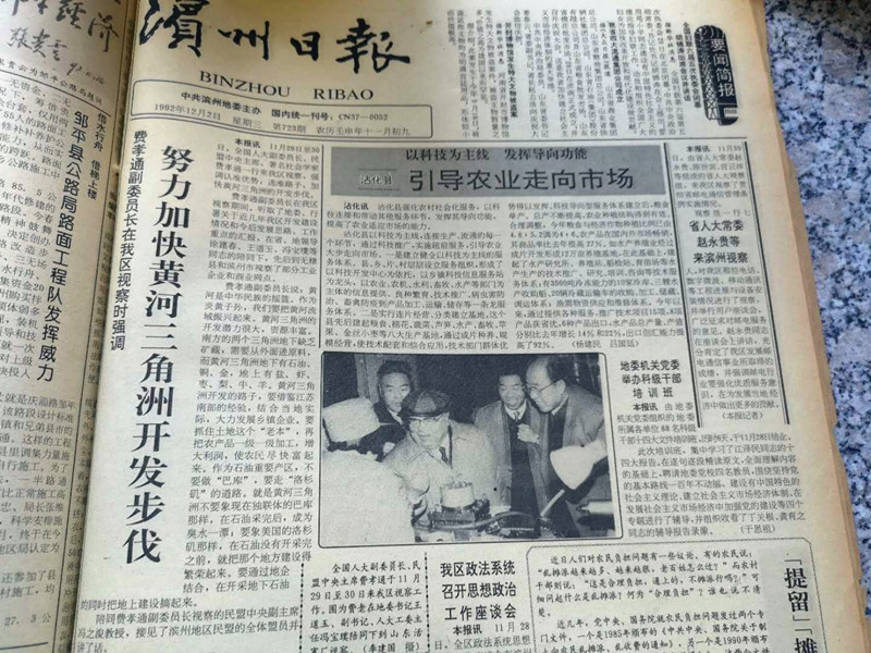 这是1992年12月2日,滨州日报头版头条报道的《费孝通副委员长在我区视察时强调:努力加快黄河三角洲开发步伐》节选内容。
