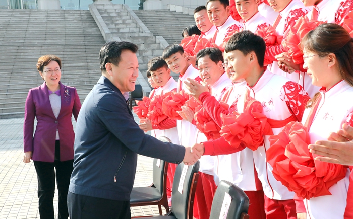 市委书记、市人大常委会主任张光峰与冠军代表握手