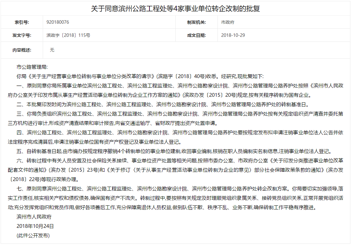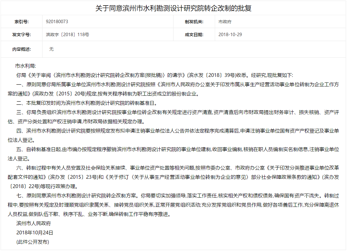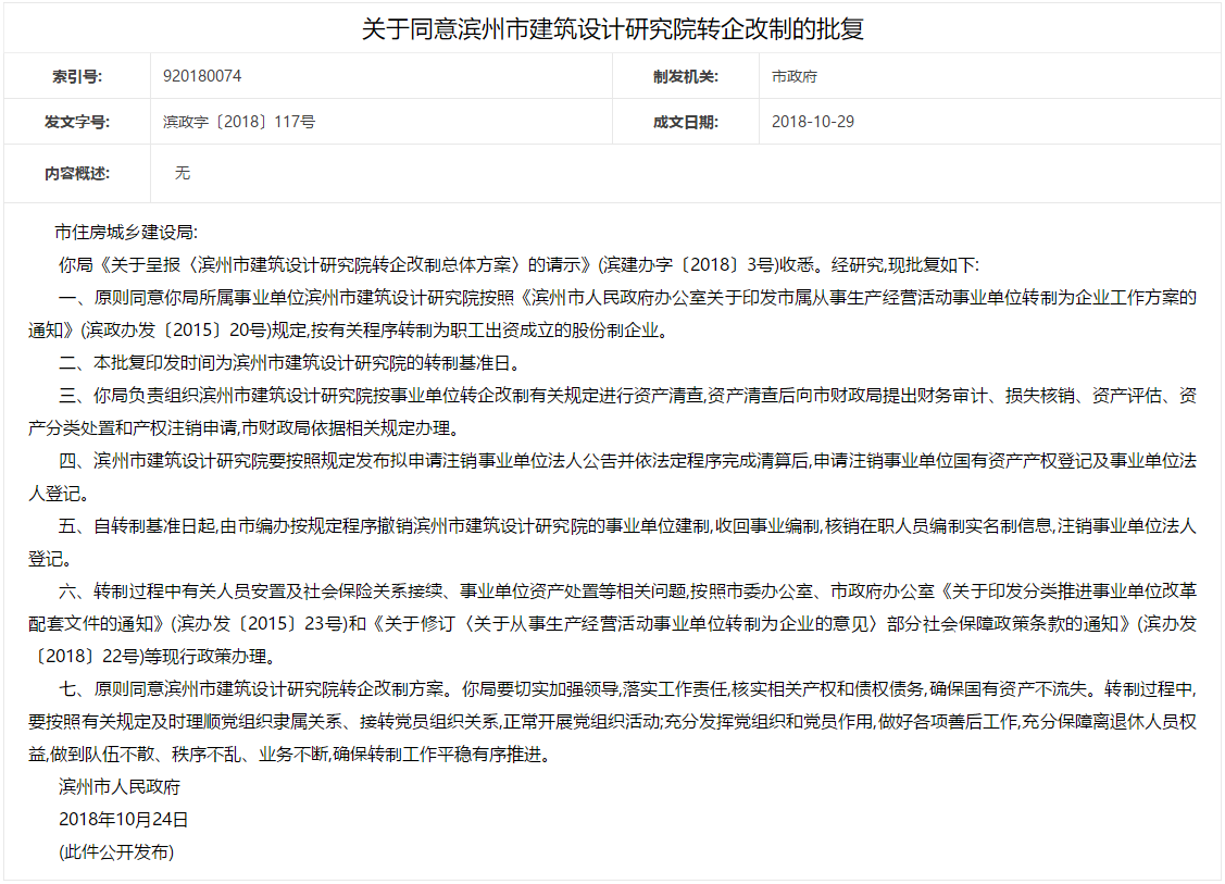 权威发布!滨州市政府发文批复7家事业单位转企改制