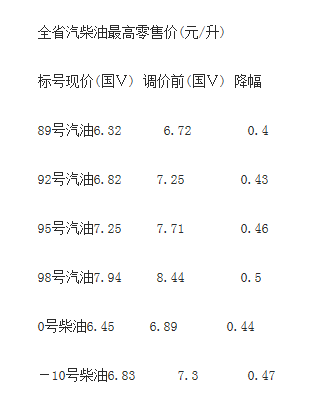 根据省物价局通知,此次调价后,我省92号汽油为6.82元/升,每升下调0.43元,时隔7个多月后重返“6元时代”,私家车加满一箱油(以50升计算)可以节省21.5元;95号汽油为7.25元/升,每升下调0.46元;0号柴油为6.45元/升,每升下调0.44元。“三连降”期间,92号汽油每升累计下调1.13元,私家车加满一箱油可以节省56.5元。