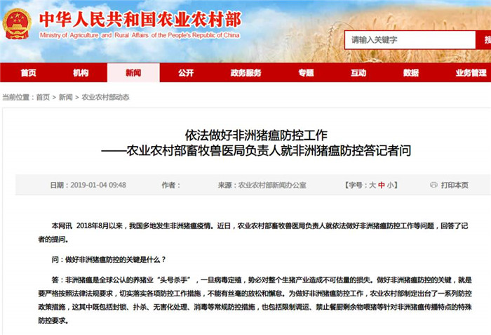 2018年8月以来,我国多地发生非洲猪瘟疫情。近日,农业农村部畜牧兽医局负责人就依法做好非洲猪瘟防控工作等问题,回答了记者的提问。
