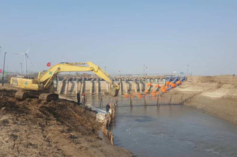 二是全员皆兵,同困难战斗。潮河治理工程作为“五河同治”的首战,容不得任何闪失。工作专班带领全体参建人员全员皆兵,以战斗员的姿态投入到工作中。为了使下游挡潮排水拦河大坝排水泵尽早运行,施工单位配合生产厂家挑灯夜战,通宵调试,3月18日夜间12台混流泵(日排水能力80万立方米)调试成功,比原计划提前两天。3月19日下午,工作专班与施工人员实地查看水情,在现场研判制定大坝合拢方案,充分考虑十五天文大潮不利影响,决定晚 18时30分拦河坝开始合拢,抢抓退潮的黄金两小时,加人加机,21时25分顺利实现合拢。同时,为了减轻排水压力,工作专班拟定了两套导流方案,经上报市政府批准,3月23日启动江河分流方案,经连夜施工,3月26日21时06分将沾化电厂冷却水分流入江河,22时50分完成沾化电厂冷却水入潮河口的封堵。尽管施工中困难重重,工作专班以“办法总比困难多”的战斗精神攻坚克难,确保了整个工程顺利推进。