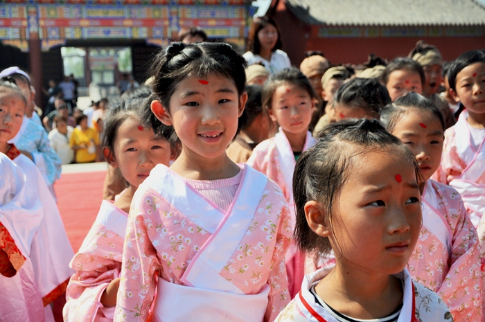 在老师的指导下,稚子们先在大殿前整理衣冠。《礼记》记载:“礼义之始,在于正容体,齐颜色,顺辞令。”因此,古代开学仪式的第一课即是“正衣冠”。“衣冠”不仅仅只是意味着遮羞,更重要的是反映人的外在形象精神面貌。