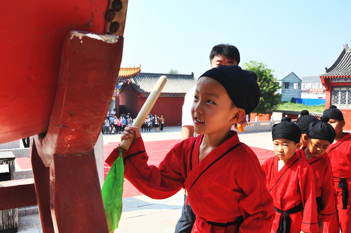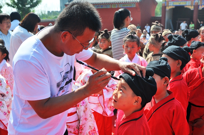 随后,孩子们依次登台击鼓三次。鼓声隆隆,寓意孩子们今后能够目明耳聪、茅塞顿开、创业建功。敲完鼓的孩子,进入大成殿内列队站好,面对孔子坐像,双手向前伸直,作高揖,三拜圣人像。礼毕后,由老师带回大成殿下,开始进行“朱砂点痣”仪式。老师拿毛笔蘸朱砂为刚刚入学的孩子的额头正中点上红痣,称之为“开天眼”。其寓意着孩子们从此开启智慧,目明心亮,希望学生日后的学习能一点就通。