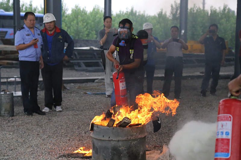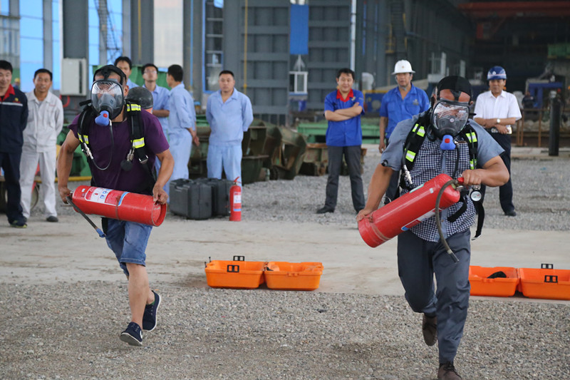 本次大比武共设置了双人佩戴空气呼吸器救援、消防灭火器使用、煤气泄漏事故的应急抢险救援等比武项目。比赛现场分设两个火点,每支代表队分派两名队员上场, 按照比赛要求,在接到灭火指令后,携带灭火器跑到指定地点,做出规定动作灭火,比武按用时多少决定名次。比赛过程中,参赛队员们扛起灭火器冲向了火点,拔 出保险销,对准火苗,迅速喷射灭火,动作一气呵成。