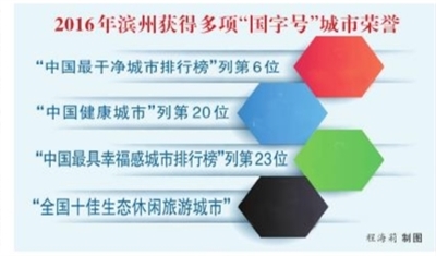“中国最干净城市排行榜”列第6位、“中国最具幸福感城市排行榜”列第23位、“中国健康城市”列第20位、荣获“全国十佳生态休闲旅游城市”……2016年,滨州收获了不少“国字号”荣誉,城市知名度和美誉度大幅提升。这一项项在全国排名领先的指标,意味着“生态美丽幸福新滨州”这个我们追求了多年的目标已逐步变为现实。今后,滨州人民有更加充分的理由感到自豪、自信,生活变得更加有尊严。