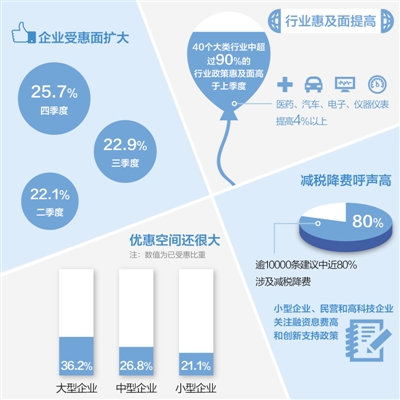 调查结果也同时显示出,四季度受益优惠政策的大、中、小型企业比例分别也只有36.2%、26.8%和21.2%,说明政策惠及面还有较大提升空间。在调查收到的逾万条建议中,有近八成涉及减税降费,小型企业以及民营和高科技企业较为关注融资息费高等问题和创新支持政策。因此,应进一步加大对小型企业优惠政策的宣传指导和落实力度,以使优惠政策覆盖更多企业。(记者 陆娅楠)