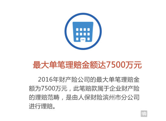 2016年财产险公司的最大单笔理赔金额为7500万元,此笔赔款属于企业财产险的理赔范畴,是由人保财险滨州市分公司进行理赔。2013年10月,博兴某公司焦化装置煤气柜在生产运行中发生爆炸事故,造成重大财产损失及人员伤亡,由于事故责任认定比较复杂、理赔金额巨大,因此直到2016年,双方才达成理赔协议。7500万元也是滨州市目前为止最大的一笔赔款。