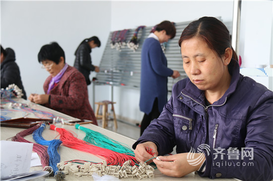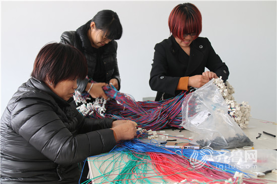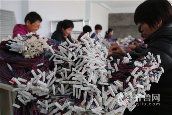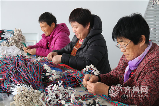 图为滨州市博兴县陈户镇董府家园社区高龄及离岗失业人员为青岛海尔集团一企业组装电路插头