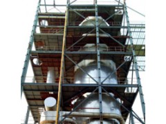空气经过滤器进入冷却器,冷却后的冷空气进入顶部的空气分配器均分后,使空气以平行于轴线方向进入干燥室。料液经过滤后由高压泵送到干燥室顶部中心的压力雾化器,料液被均匀雾化后表面积大大增加,进入干燥室与冷风接触,在极短时间内成颗粒产品。成品由底部卸料阀排出,尾气中的粉尘由除尘器收集。