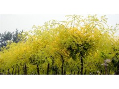 乔木,高可达20米;树皮灰褐色,具纵裂纹。生枝条秋季逐渐变成黄色、深黄色,2年生的树体呈金黄色,树皮光滑,羽状复叶叶轴初被疏柔毛,旋即脱净;叶柄基部膨大,包裹着芽;托叶形状多变,羽状复叶,椭圆形,光滑,淡绿色、黄色、深黄色。锥状花序,顶生,花梗较短,花萼呈吊钟状,具灰色绒毛,花冠黄色,具短的小柄。荚果,串状,花萼浅钟状,种子间缢缩不明显,种子排列较紧密,果皮肉质,成熟后不开裂,种子椭圆形。5-8月开花,8-10月结果。