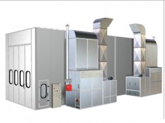 烤漆时,将风门调至烤漆位置,热风循环,烤房内温度迅速升高到预定干燥温度(55℃—60℃)。风机将外部新鲜空气进行初过滤后,与热能转换器发生热交换后送至烤漆房顶部的气室,再经过第二次过滤净化,热风经过风门的内循环作用,除吸进少量新鲜空气外,绝大部分热空气又被继续加热利用,使得烤漆房内温度逐步升高。当温度达到设定的温度时,燃烧器自动停止;当温度下降到设置温度时,风机和燃烧器又自动开启,使烤漆房内温度保持相对恒定。最后当烤漆时间达到设定的时间时,烤漆房自动关机,烤漆结束。